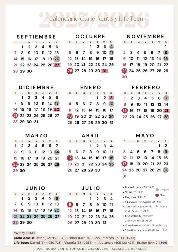 Calendario de encuentros y actividades para preadolescentes y adolescentes de la parroquia para el curso pastoral 2025-2026