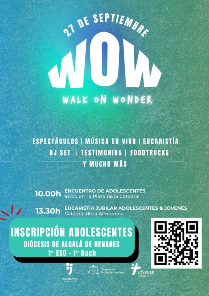 🌟El próximo 27 de septiembre las Diócesis de Madrid, Getafe y Alcalá de Henares vivirán un día histórico con el WoW Fest (Walk on Wonder), el Jubileo de adolescentes y jóvenes que promete ser uno de los encuentros más importantes del año Jubilar.Después del inolvidable Jubileo de los jóvenes en Roma, nuestros obispos nos convocan ahora a todos los adolescentes y jóvenes para un día cargado de fe, música, amistad, talleres y celebración, con un mismo objetivo: caminar juntos en la esperanza.